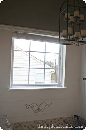So this window has been a thorn in our side for going on nine years now. Of course we love the natural light, it’s great, cause the other light in that bathroom stinks. But at night I feel like I’m in a fishbowl – not so much because of our neighbors, but because houses across the street can see in.