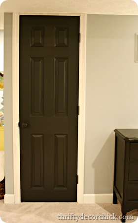 Have you painted any doors in your house a different color? Our mud room door is getting a fun color – otherwise they are all going black! By the way, this color is called Graphite from Benjamin Moore -- I had it mixed in Sherwin Williams (eggshell finish in latex paint). It’s part of the color scheme for the basement I showed you here. It’s not a true, deep black, but more deep gray, although it really looks black to me on the doors! Maybe it will look different in natural light?